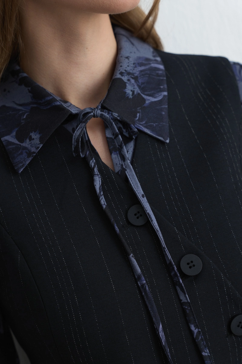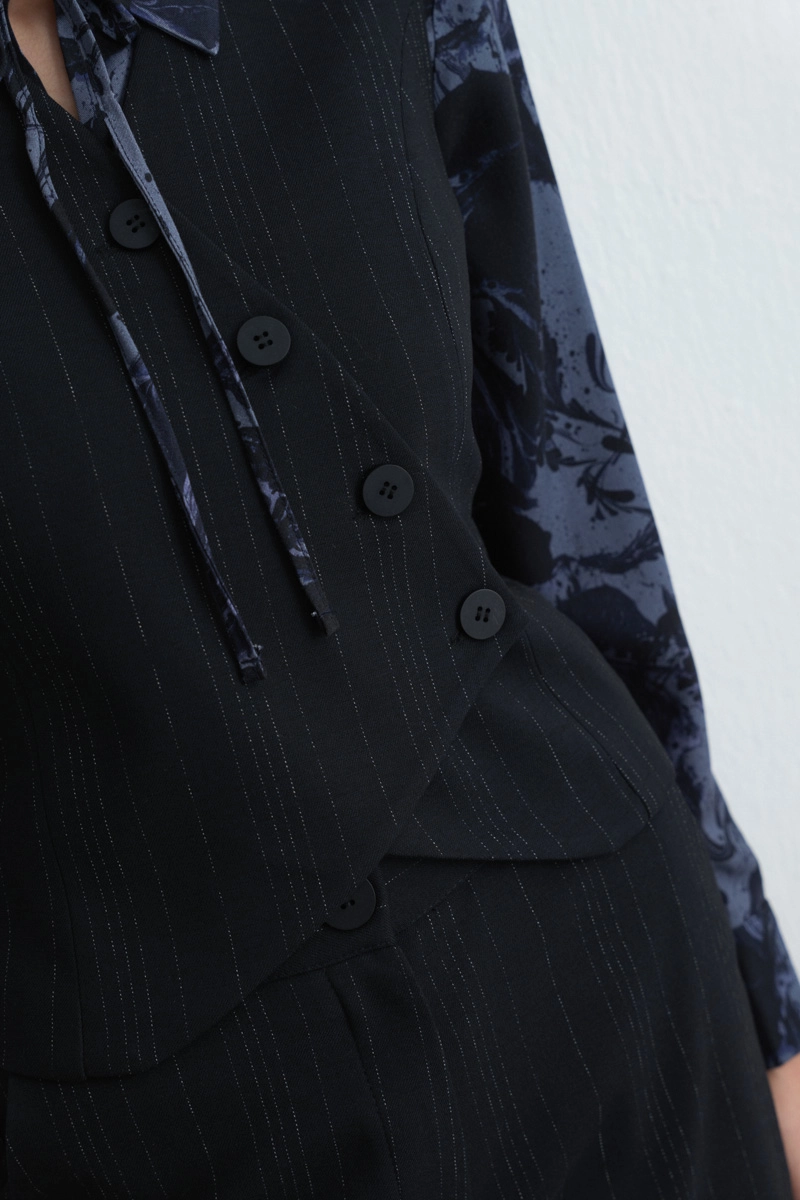 This vest, with an asymmetrical cut, offers a modern flair and combines wool texture with both style and comfort. Its navy tone provides timeless elegance and adapts easily to different outfits. Ideal for layering during transitional seasons, making it a versatile piece for office or daily styles.
