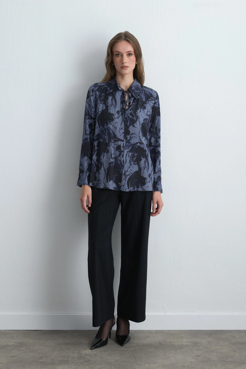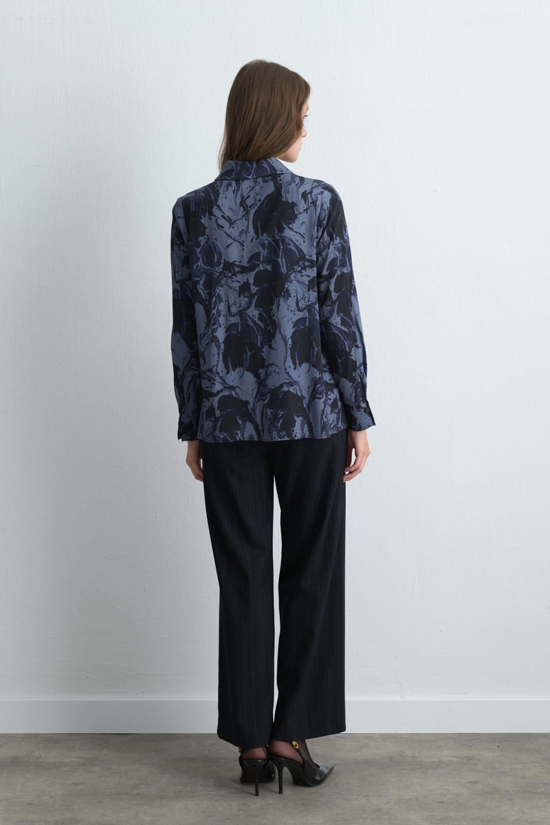 This navy blouse highlights elegance with its lively patterns, offering a modern and energetic style. Viscose fabric is lightweight and breathable, providing all-day comfort. Perfect for both work and casual outfits, and pairs easily with various bottoms. Minimal accessories enhance a refined and striking appearance.