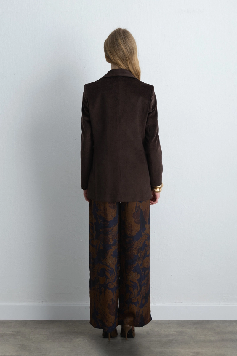 This blazer, featuring luxurious velvet fabric and ribbed details, brings a modern twist to a classic cut. The brown tone adds warmth and sophistication to winter outfits. Perfect for office or event wear. Easily paired with trousers or skirts for an elegant look.