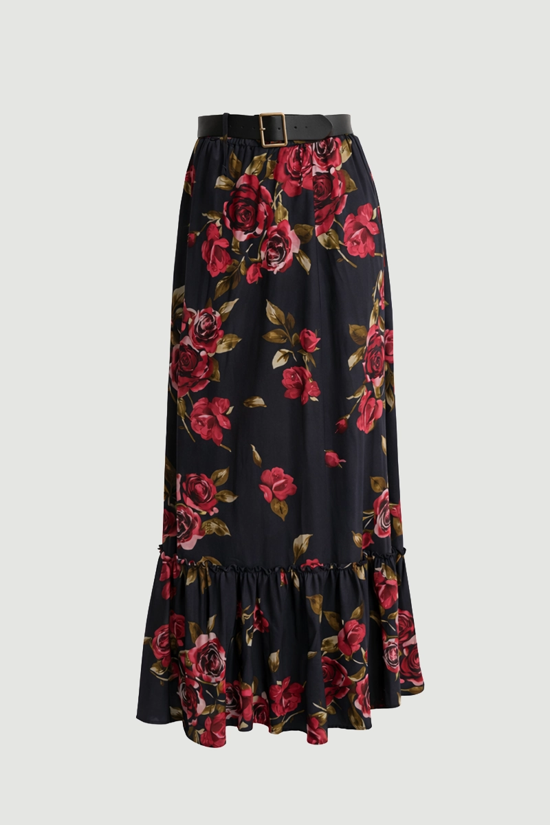 Anka Collection Rose Patterned Long Viscose Skirt Black