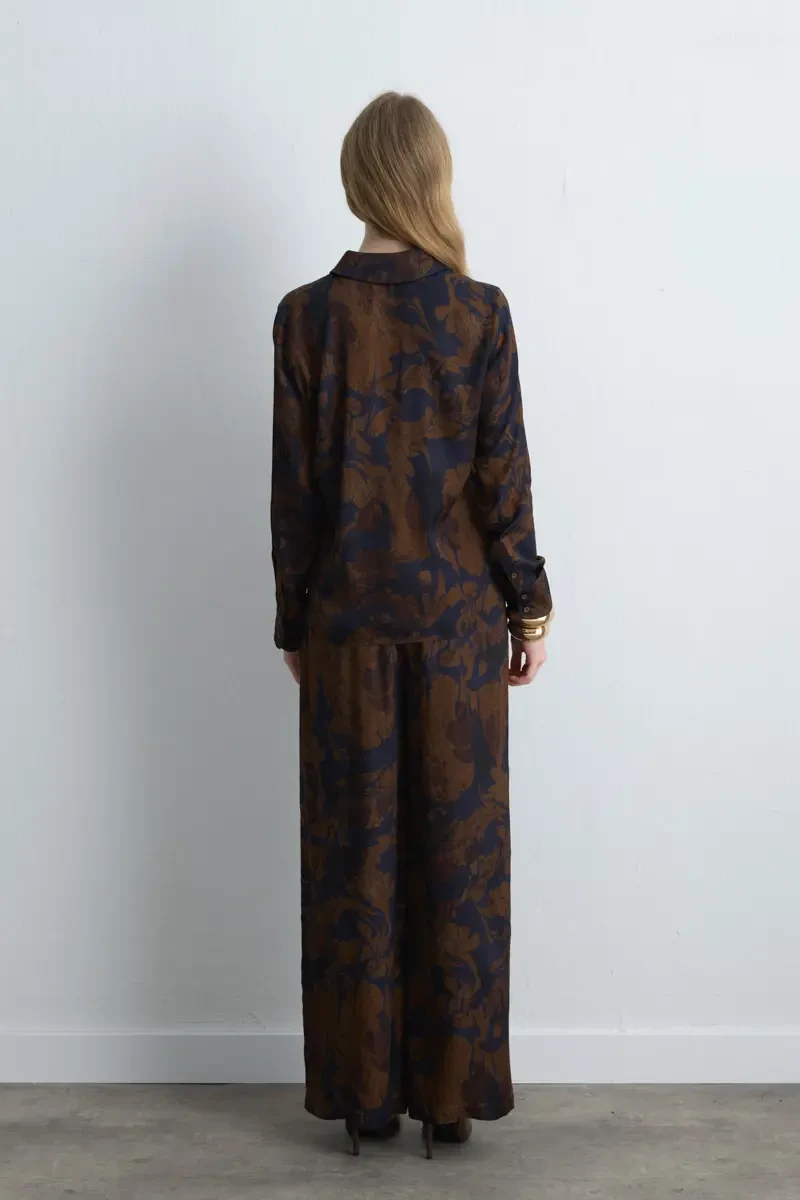 This brown shirt, featuring a flowing viscose satin texture, offers an elegant appearance and is suitable for office and stylish daytime outfits. Its minimal design makes it easy to combine and creates a modern style. The soft fabric ensures comfort throughout the day.