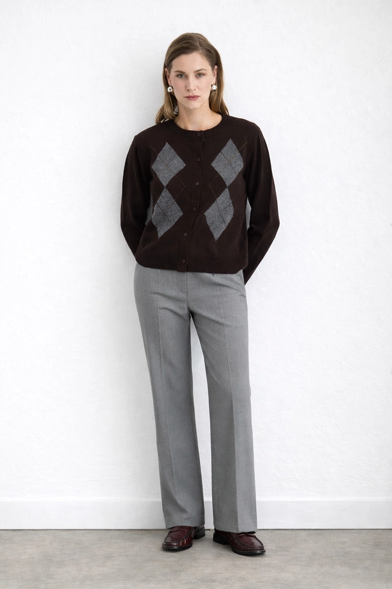 Argyle Patterned Designed Knit Wool Cardigan Brown