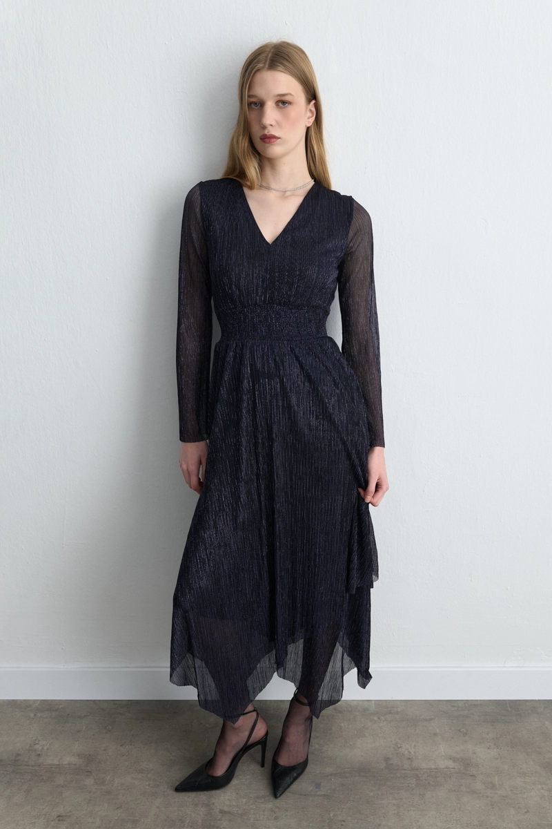 The navy tone adds refined sparkle. Its glittery fabric makes a striking impact in evening events. The asymmetric cut provides a modern and dynamic silhouette. The V-neck detail adds feminine elegance. Creates an eye-catching look in any setting.
