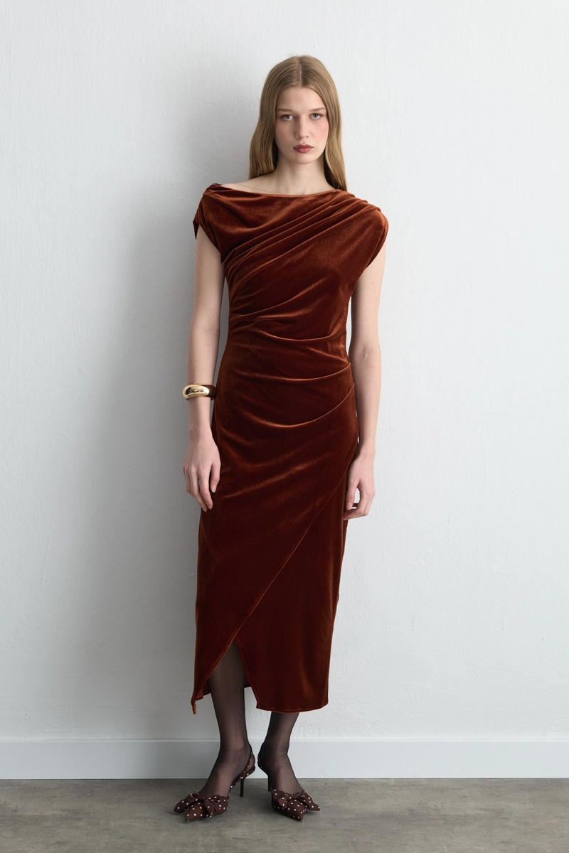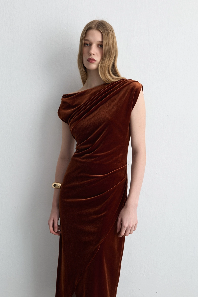 The terracotta tone gives a warm and sophisticated feel. The velvet fabric provides luxurious shine and softness. The asymmetric shoulder cut creates a modern appearance. The long form offers a graceful silhouette. A bold and elegant choice for special occasions.