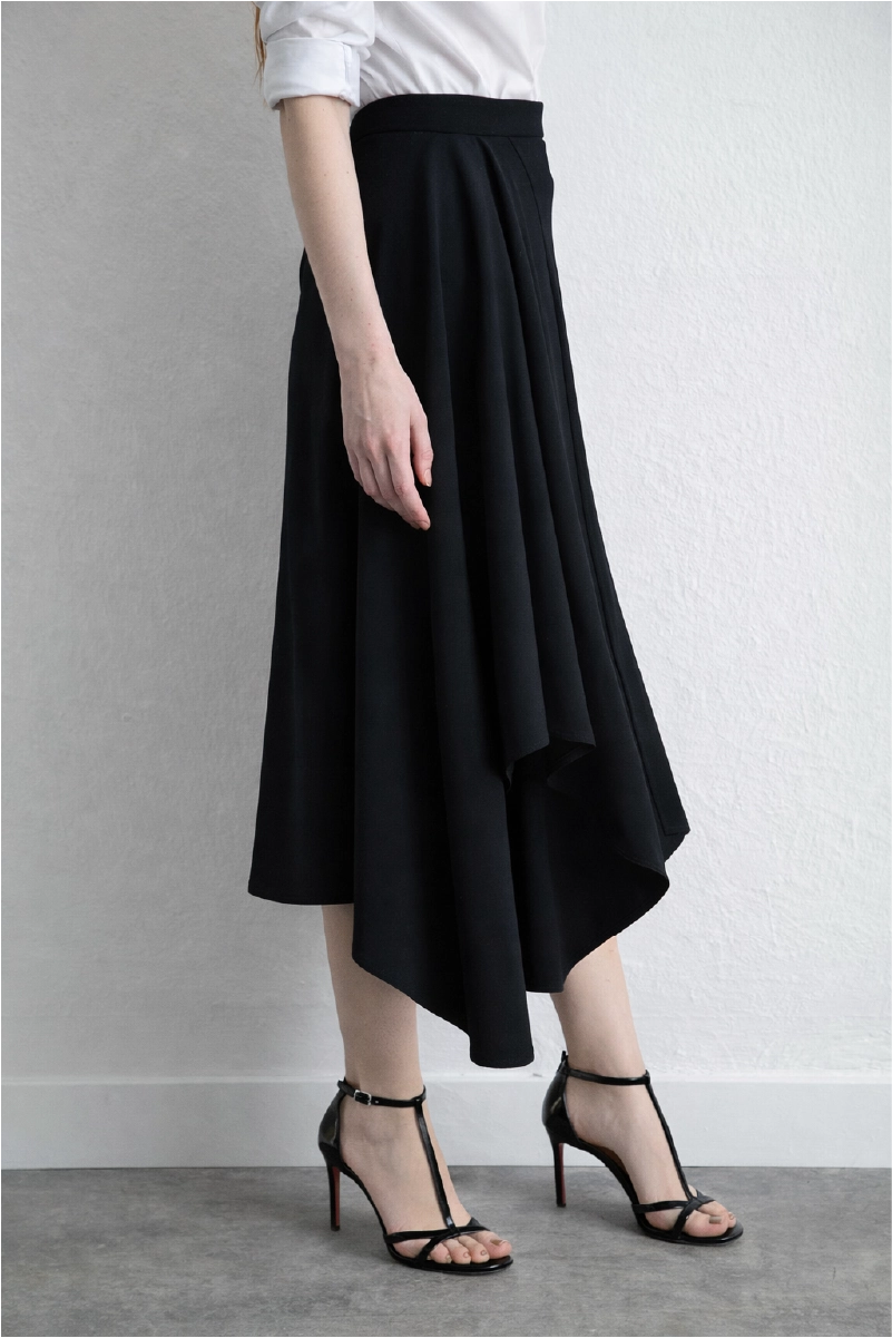 With its modern cut, the navy wool skirt stands out with an asymmetric form that creates a dynamic silhouette. The wool-blend fabric keeps you warm while providing a stylish option for office or city outfits.