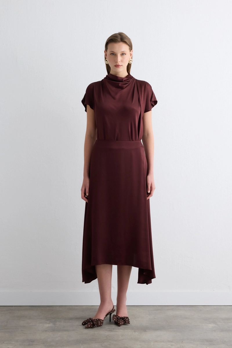 Vivid color highlights your elegance. Asymmetric form adds a unique touch. Satin texture ensures a flowing look. Can be styled with both simple and bold combinations. Ideal for special occasions.
