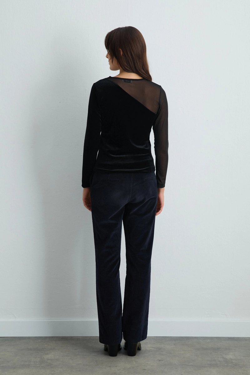 Asymmetrical Tulle Collared Velvet Blouse Black