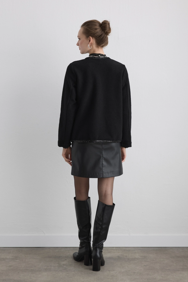 Handcrafted bead details add a delicate sparkle to the classic jacket. The wool texture provides warmth, and the intricate detailing gives it a unique character. A design that blends elegance and craftsmanship.