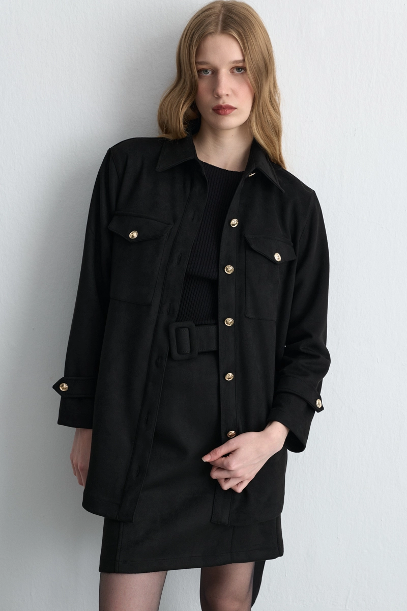 The black tone offers a classic and elegant appearance. The suede texture provides a modern and luxurious feel. The belted waist design subtly accentuates body lines. The straight cut works for daily and special outfits. It completes a stylish urban look.