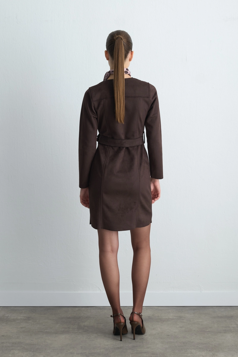 Soft Suede Fabric Offers Modern And Natural Elegance. The Belted Waist Creates An Elegant Silhouette. The Brown Tone Provides Warmth And Sophistication. Complements Well With Boots And Leather Accessories.
