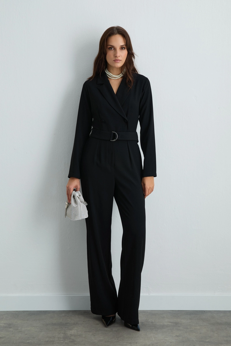 Black jumpsuit with a blazer collar combines style and sophistication, offering a modern silhouette. Crepe fabric provides a graceful drape and flowing appearance. Suitable for everyday wear as well as special occasion outfits. Minimal details create a sophisticated look.