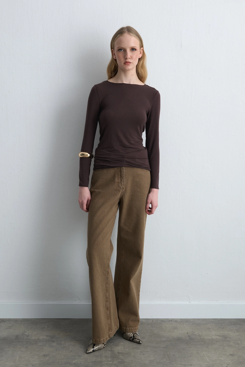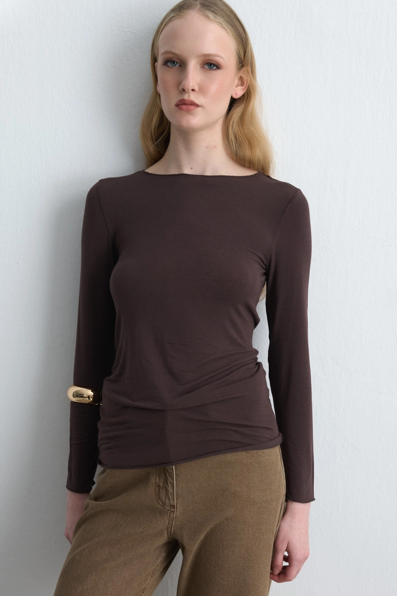This cashmere blouse in a natural brown shade with a refined bateau neckline exudes sophisticated elegance. The cashmere fabric keeps you warm while offering soft comfort. A timeless piece that effortlessly fits various styles, from daily wear to office ensembles.