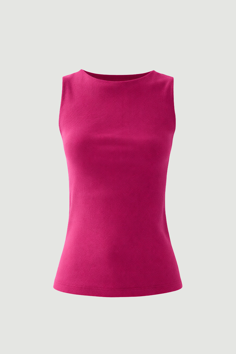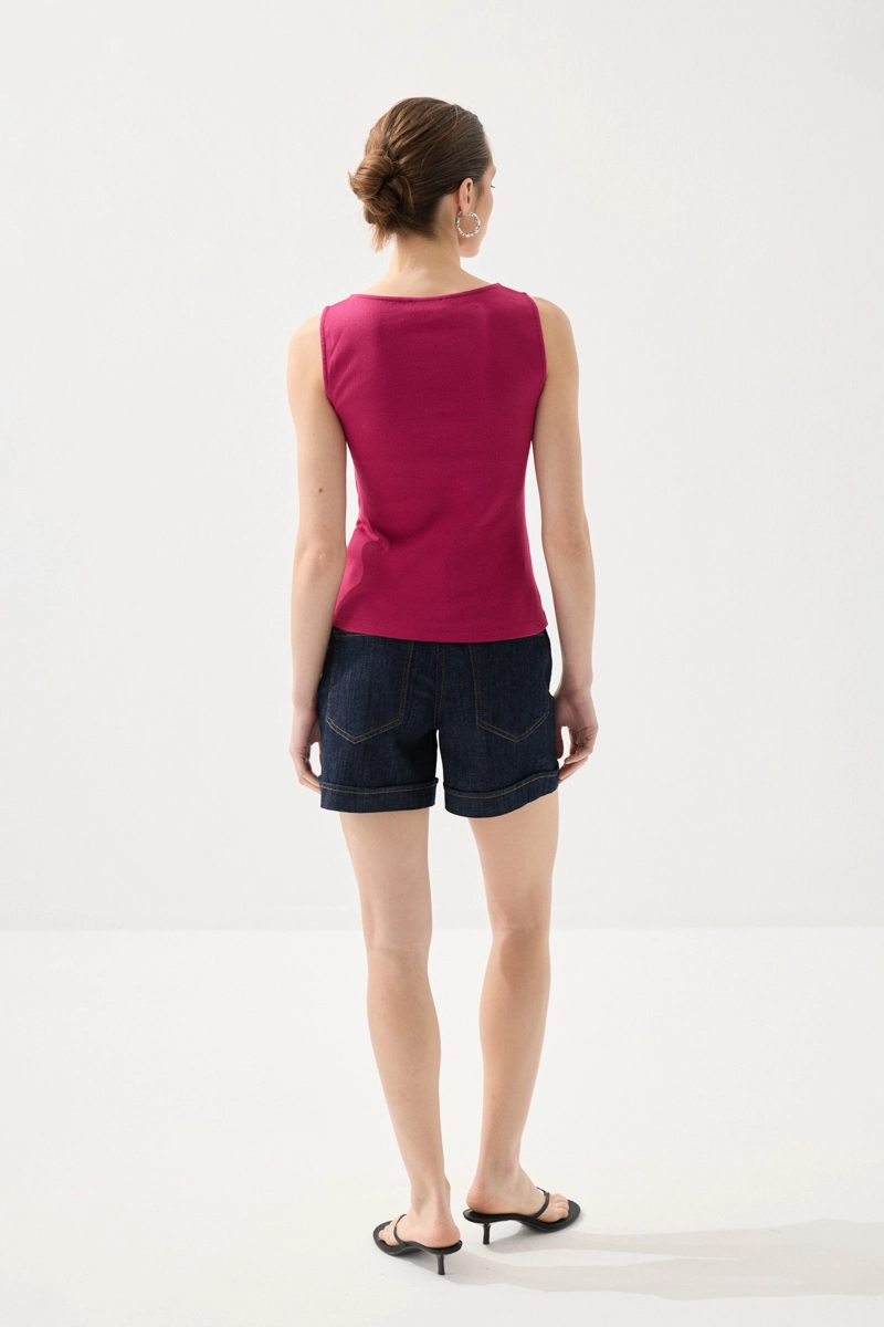 Its cotton structure provides all-day comfort. The boat neck detail offers a modern and feminine style. The fuchsia color creates an energetic and eye-catching look. It adds vibrancy to summer outfits.