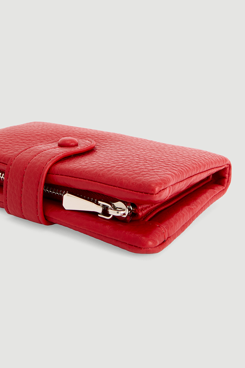 Vivid red tone adds an energetic appearance. Buttoned design provides a modern touch. Small size fits easily in bags. Offers both functional and stylish accessory alternative.