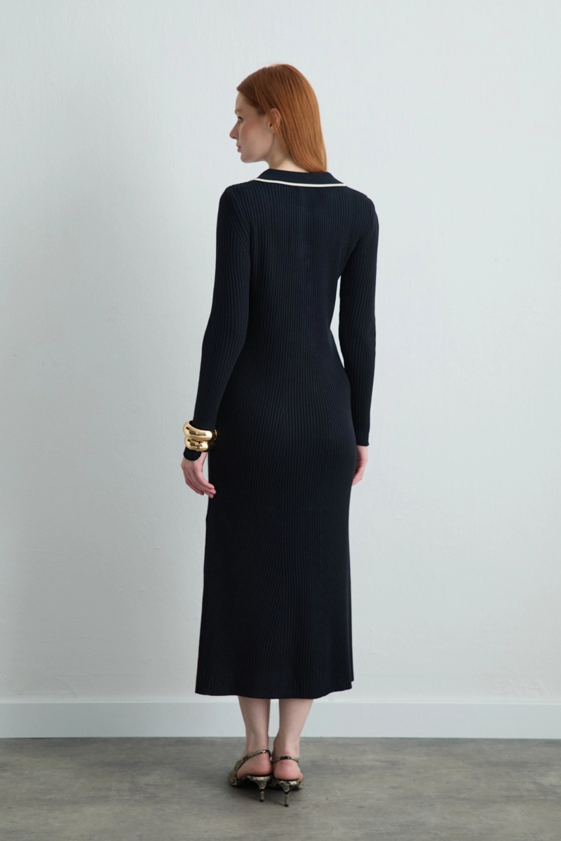 Designed in a sophisticated navy tone, this polo-neck knit dress offers timeless elegance with button details. The knit structure gives a graceful fit, making it an ideal choice for those seeking a simple yet refined look.