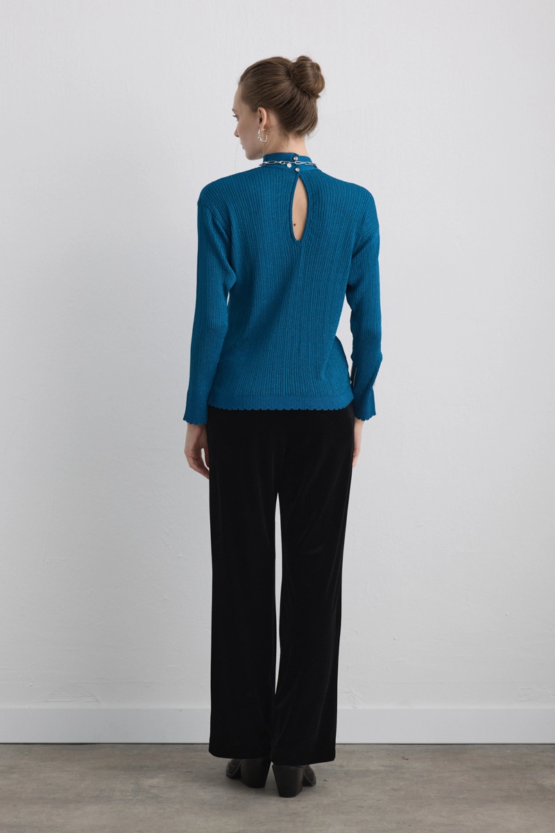 Button Neck Rayon Knit Blouse Blue