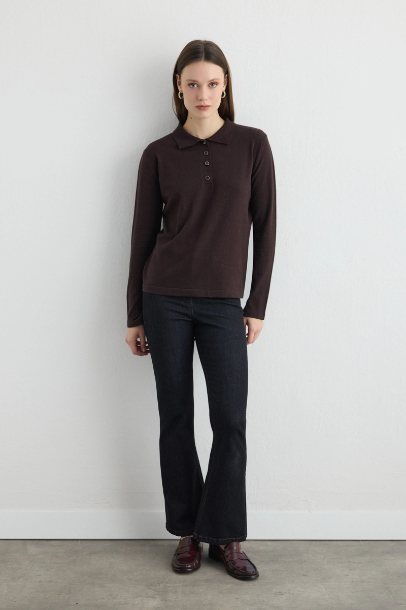 The polo collar cut offers a classic and sporty look. Button details enhance elegance. Brown tones add warmth to outfits. Knit texture provides a comfortable and practical style. Suitable for daily or office outfits. Minimal accessories enhance sophistication.