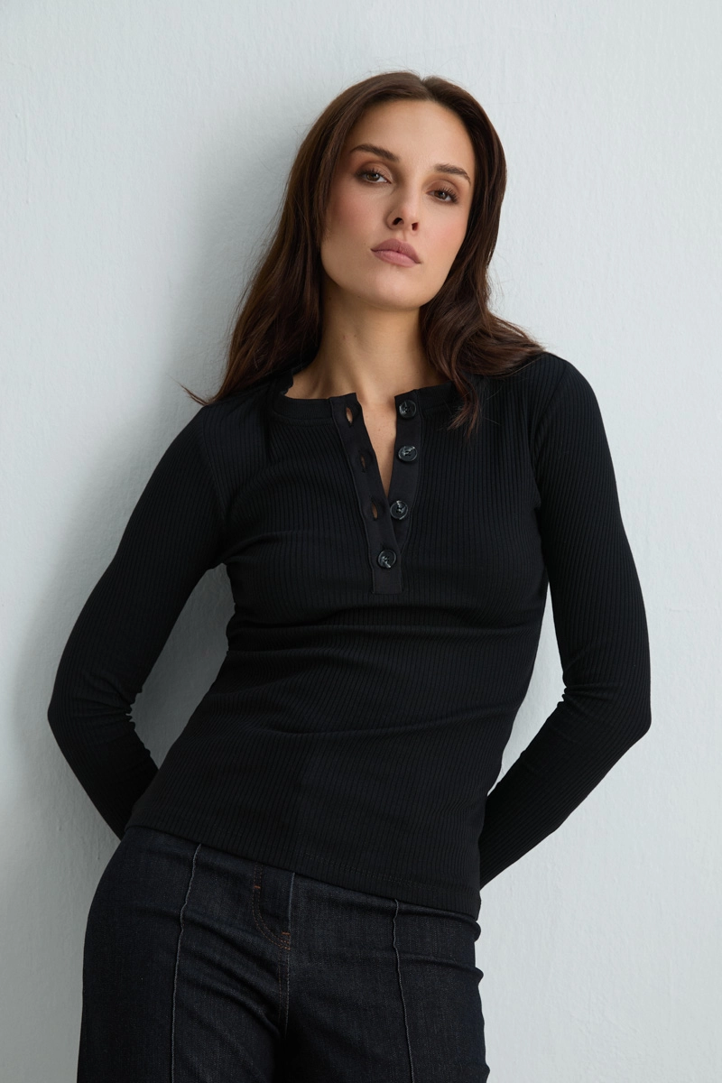 This blouse offers comfortable wear with its soft cotton ribbed fabric and stands out as a favorite in your wardrobe with its simple yet elegant design. The round neckline and front buttons add a refined touch to a basic piece. Can be easily paired with jeans or skirts for everyday wear and layers well with jackets or cardigans.