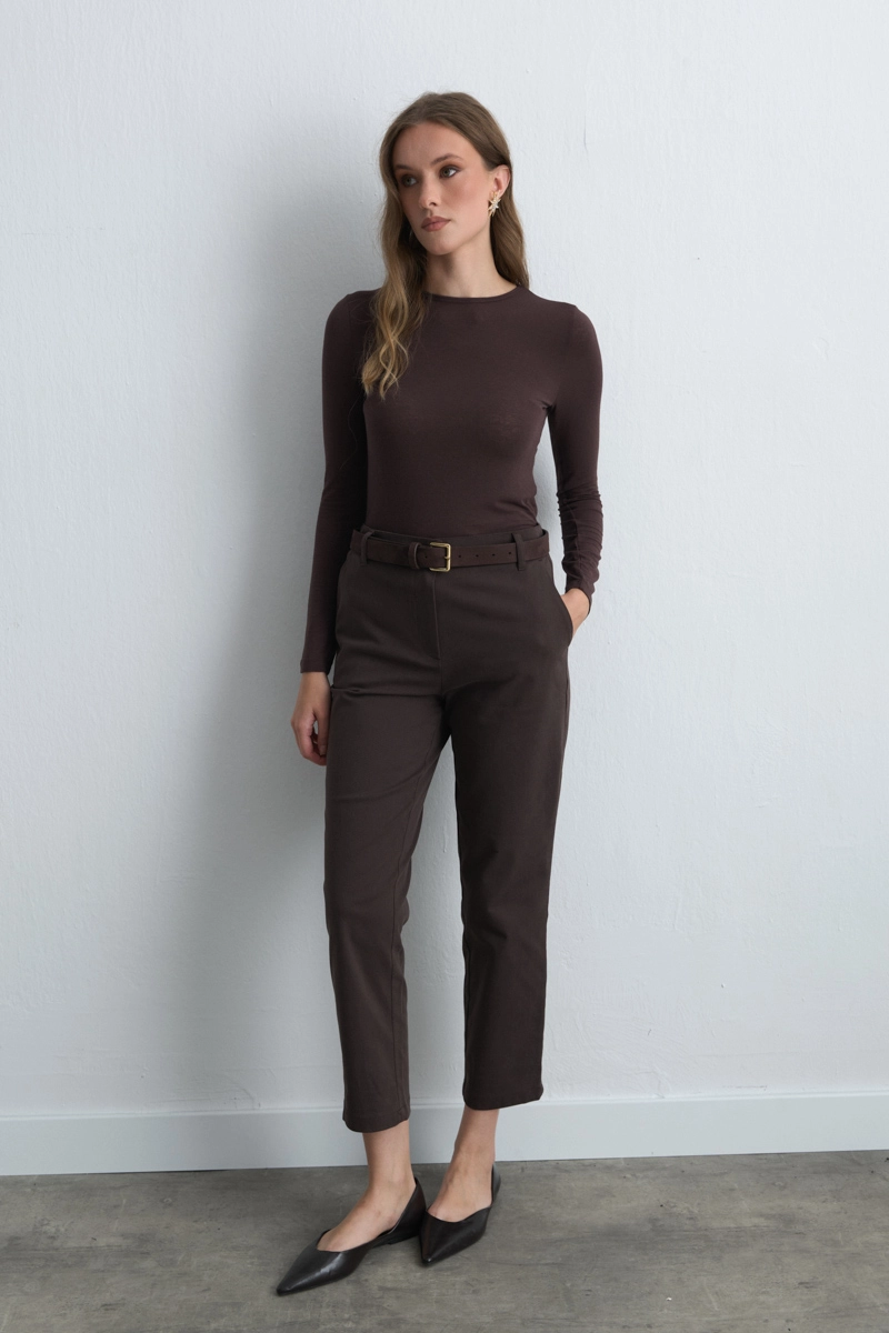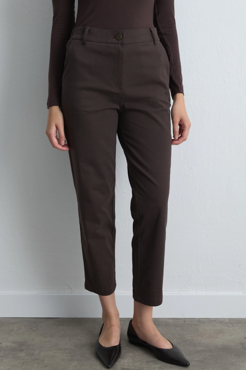 This brown canvas mom pant, highlighted for its relaxed fit and modern cut, is an essential for everyday chic. Its durable fabric ensures long-lasting wear, and its loose modern silhouette adapts easily to different combinations. Can be styled with sneakers, boots, or heels for various looks.
