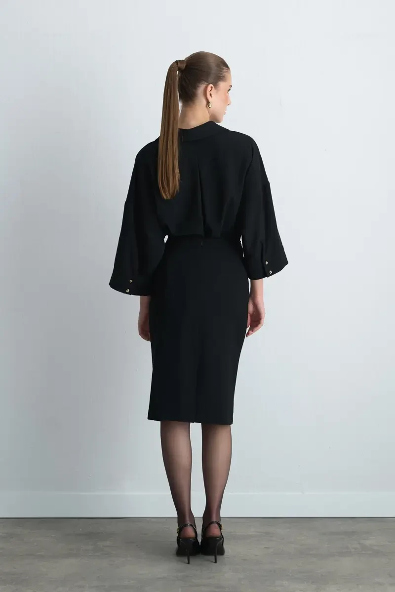 Crepe Fabric Provides Graceful Fluidity. Pencil Form Creates A Feminine Silhouette. The Black Tone Offers Timeless Elegance. It Stands Out In Both Office Outfits And Special Occasions.