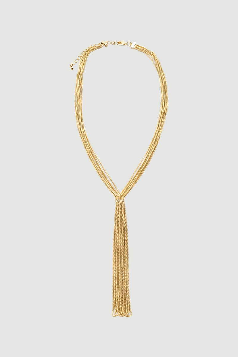 Dangling chain details add movement to the design. Gold color provides an elegant and feminine look. Especially pairs well with open-neck outfits. Suitable for daily and evening wear.