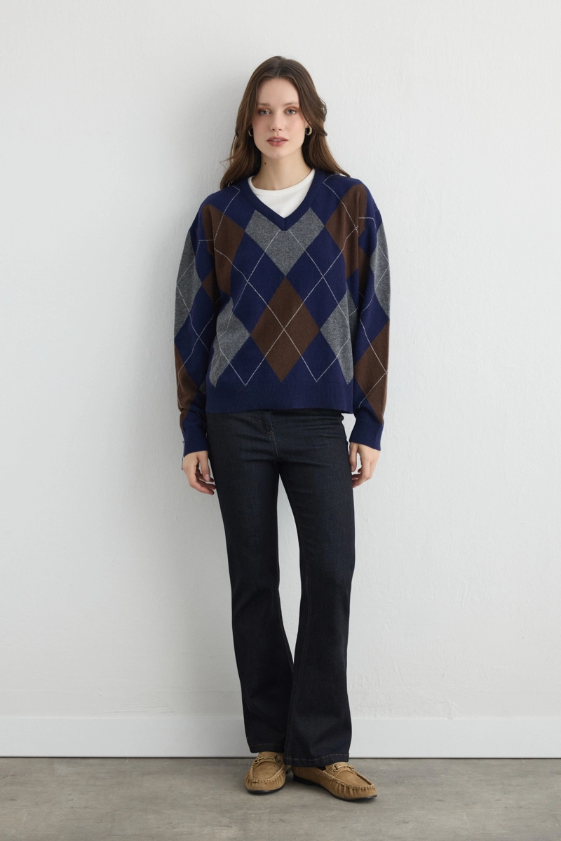 The diamond pattern becomes the focal point of the style. The V-neck cut provides a feminine and elegant appearance. The wool texture offers warmth and comfortable wear. Navy tones create a modern and sophisticated effect. Easily suitable for daily or office outfits. The detailed texture emphasizes the character of the style.