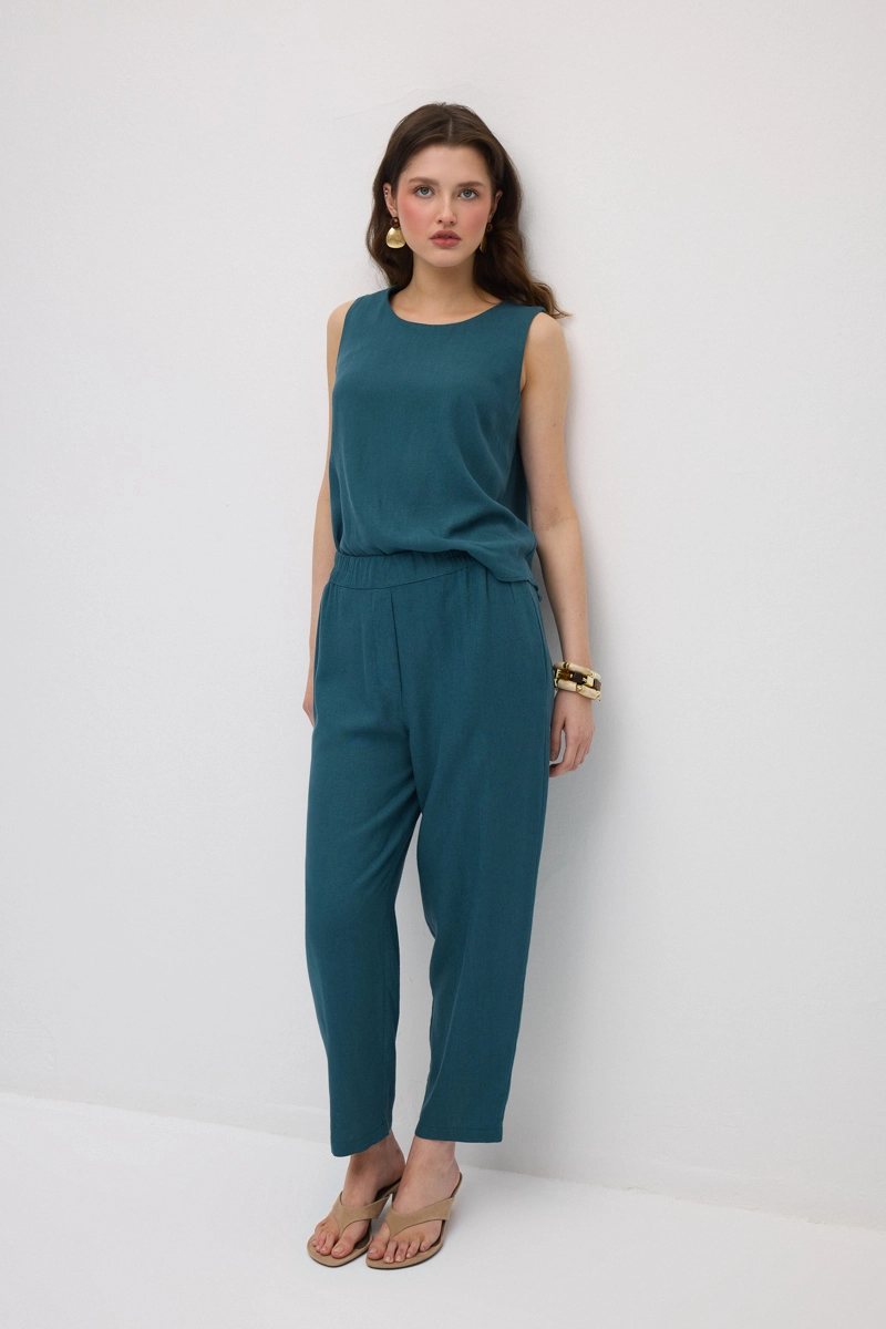 Elastic waistband provides comfortable wear. Carrot cut creates a modern and balanced silhouette. Ideal for daily wear, offering a relaxed and stylish alternative. Lightweight fabric ensures freedom of movement. Vibrant tone adds an energetic touch to outfits.