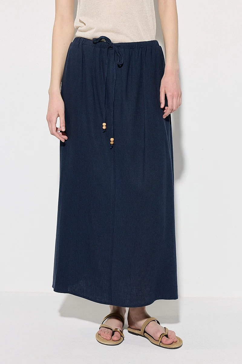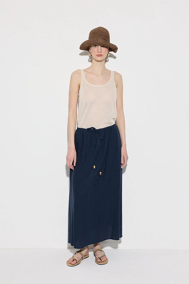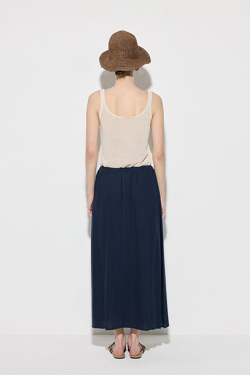 This linen skirt, prioritizing comfort with its elastic waistband and relaxed fit, offers a fresh feel with its lightweight texture. Its breathable fabric makes it an ideal choice for warm weather. Its long form creates an elegant silhouette. It can be easily worn in both casual and chic combinations. With its timeless design, it is set to become a wardrobe essential.