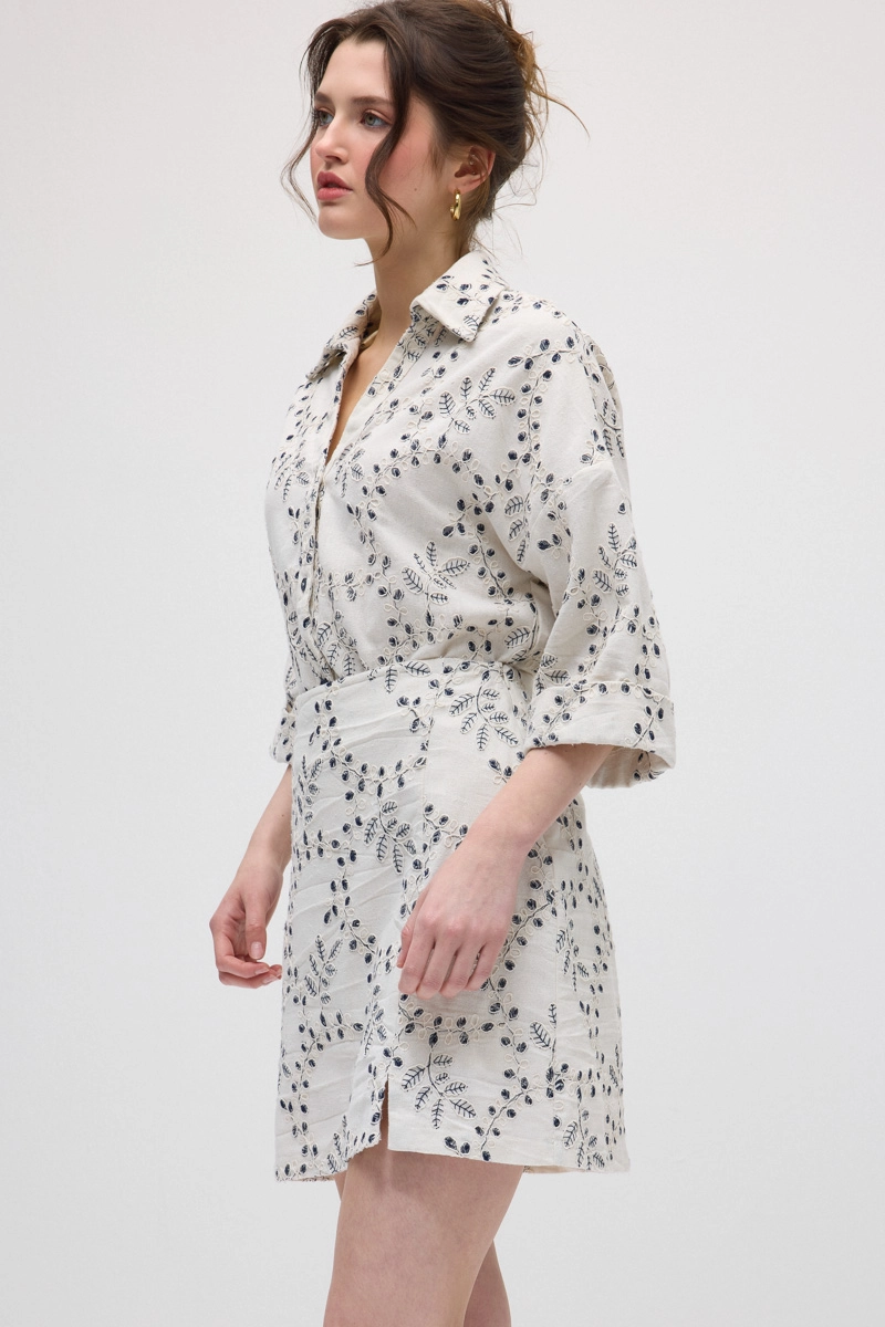 A cotton mini skirt enriched with delicate embroidery details offers a feminine and modern style. The simple and chic ecru color pairs easily with different tops, completing daily elegance. Its lightweight and comfortable fabric ensures all-day comfort, while the mini length adds a dynamic look. It is a stylish piece suitable for both city style and summer outfits.
