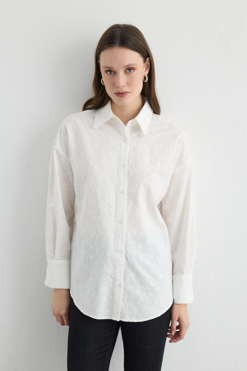 Embroidery details add a sophisticated and elegant touch. The relaxed fit provides comfort and everyday style. White tones coordinate with any outfit. Cotton fabric is breathable and lightweight. A practical choice for daily or work outfits. Its simple and stylish design blends well with various bottoms.