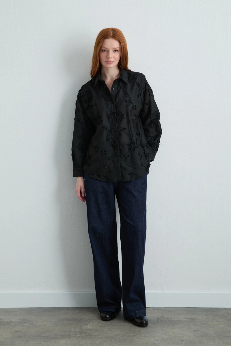 Shirt designed with elegant embroidery details on a black background offers a minimal yet stylish look. Suitable for both daily and special outfits. Its soft cotton fabric ensures comfortable wear throughout the day.