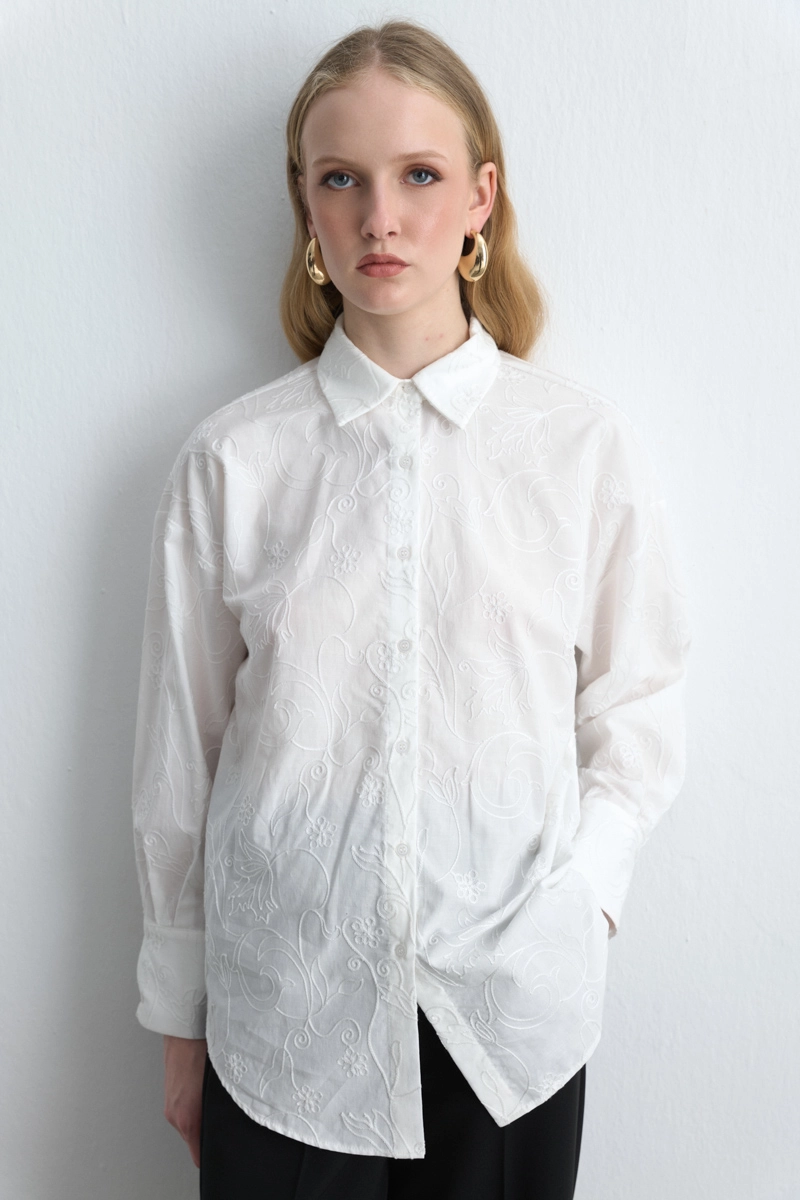Elegant white cotton shirt with delicate embroidery details adds a modern touch to a classic piece. Its comfortable cotton texture provides all-day ease. A versatile item suitable for both office looks and everyday elegance.
