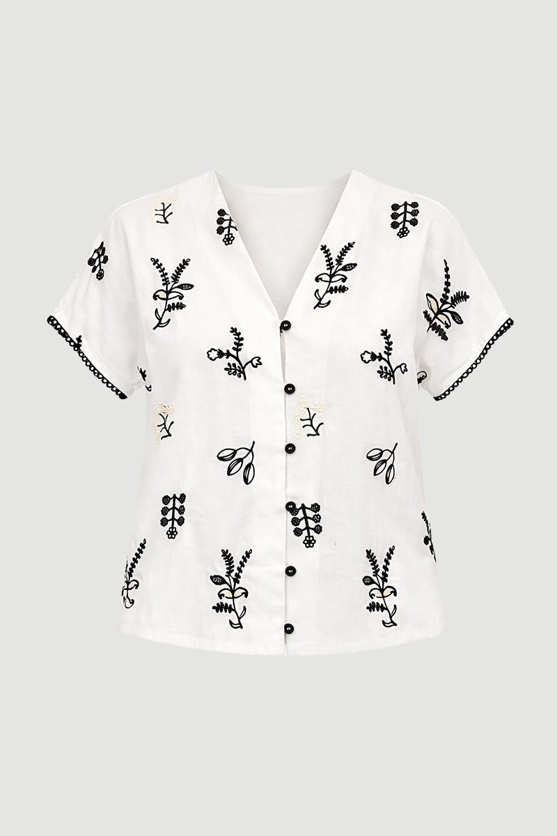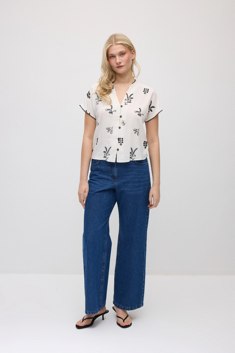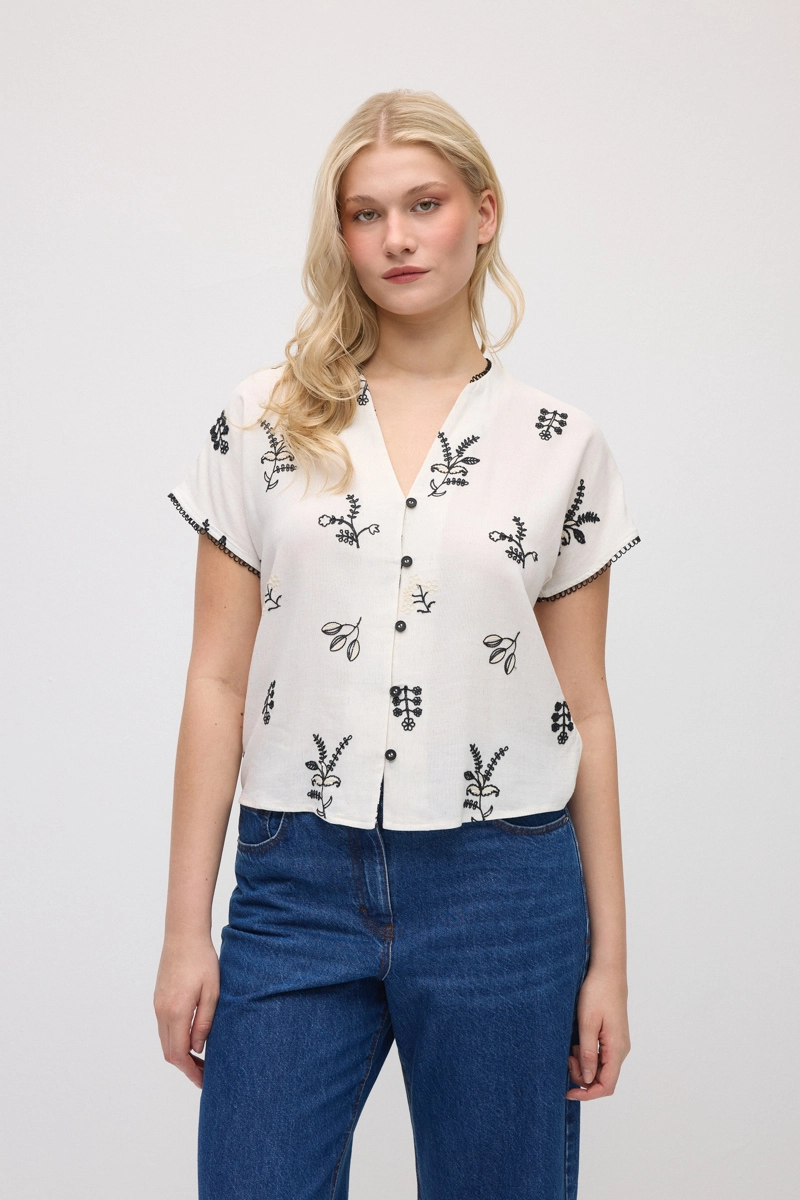 This design enriched with delicate embroidery details offers a simple and feminine appearance. Its natural linen fabric is lightweight and breathable. The relaxed form provides all-day comfort and pairs easily with different items. Suitable for daily wear and summer outfits, it is one of the elegant pieces in your wardrobe.
