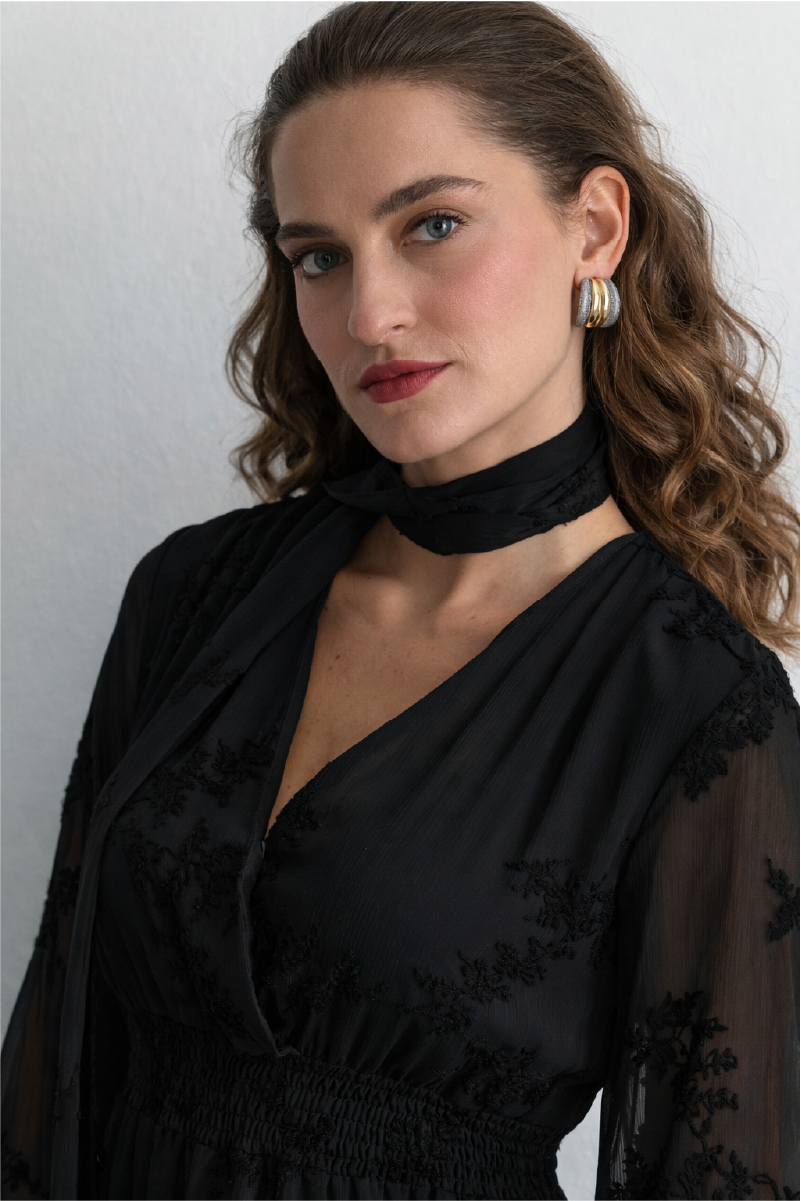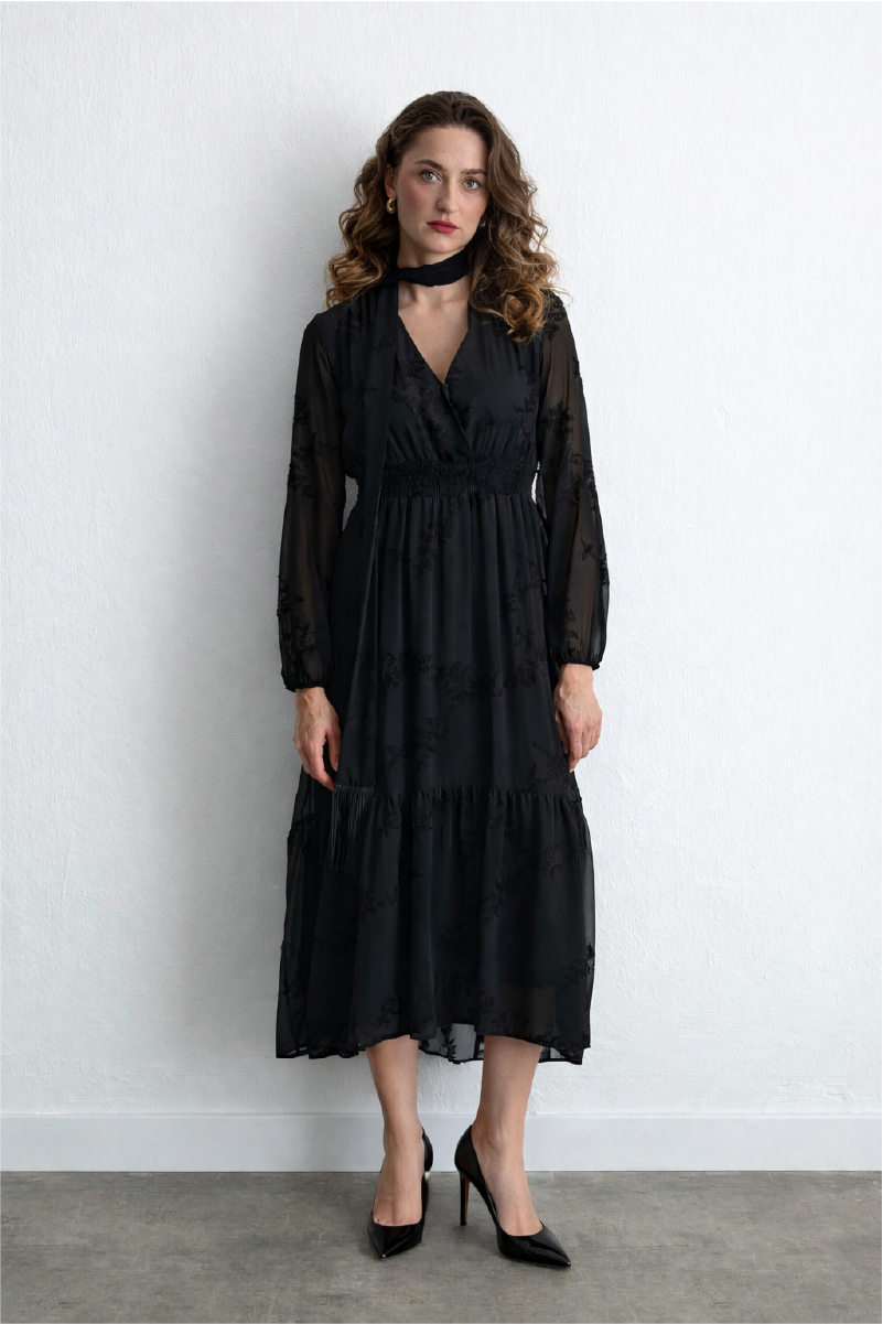 Embroidered Long Chiffon Dress with Scarf Detail Black