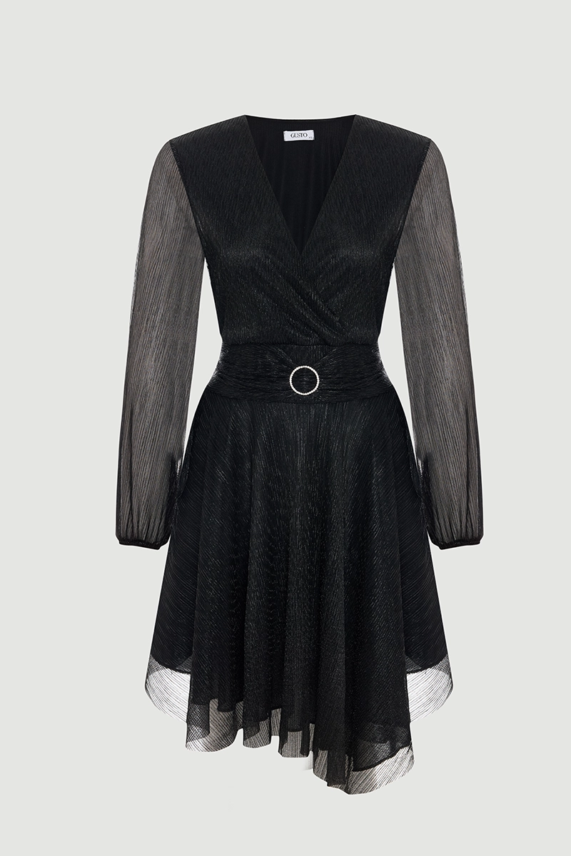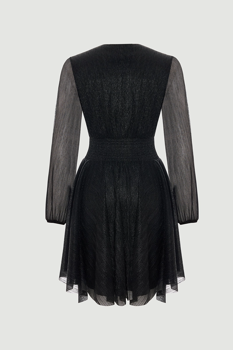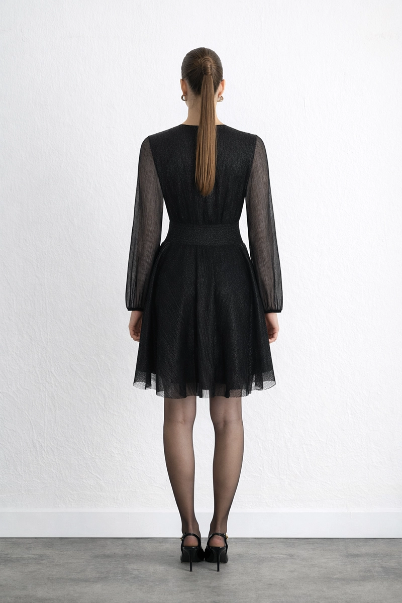 The wrap cut offers a feminine and elegant silhouette. Its shimmering surface draws attention at special events. The black tone provides a classic and sophisticated look. Its flowing structure highlights elegance. It is an ideal choice for special evenings. Elegant details enhance the power of the style.