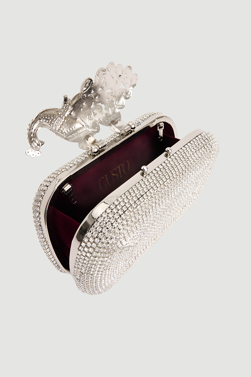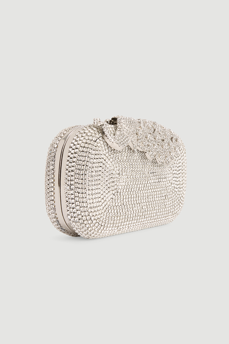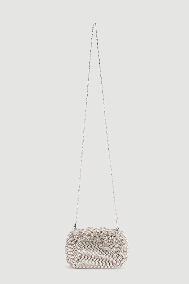 Offers striking elegance with shiny stone details. The silver tone presents a refined and modern appearance. Metal accents create a sophisticated look. Ideal as an accessory for events and special occasions.