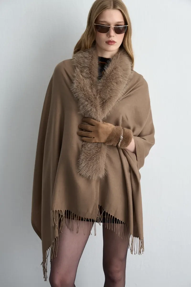 It is an accessory that brings together elegance and warmth. Its ultra-soft texture and fur detail offer both comfort and style in winter. The natural and sophisticated mink tone harmonizes with any color, adding a refined touch to your outfits. It pairs perfectly with knits or coats for daily wear, and with dresses for special occasions. While keeping you warm in cold weather, it adds a noble elegance to your look.
