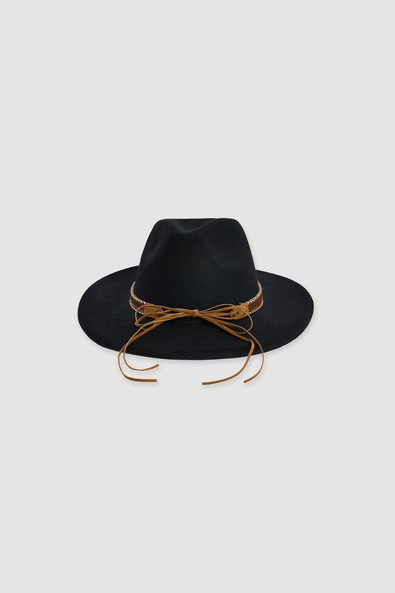 The black tone offers a classic and elegant look. Suede accessory detail adds a modern touch. The fedora shape creates a sophisticated silhouette. Its lightweight structure ensures comfortable wear. A chic choice that complements daily and special outfits.