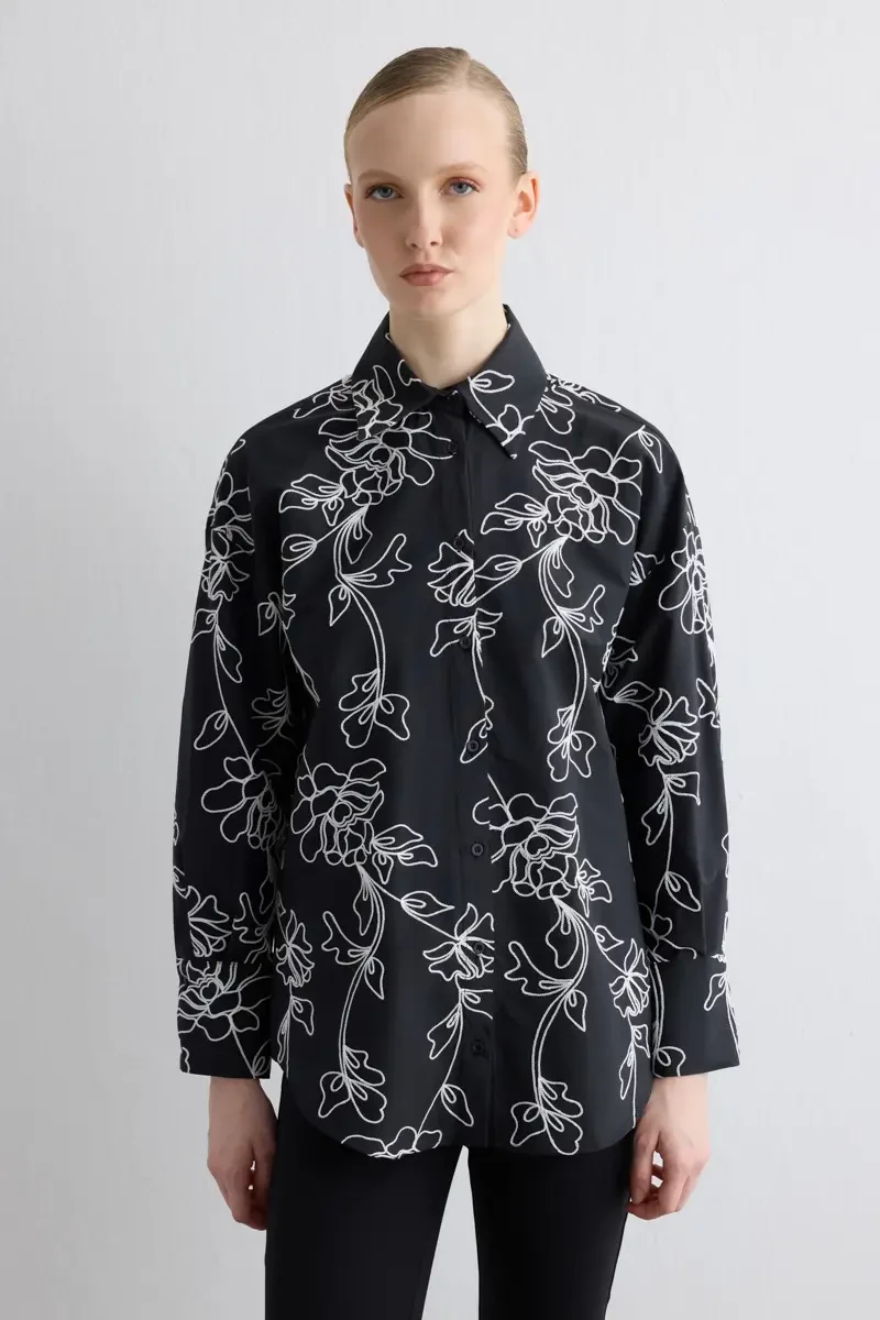 Embroidery details create a sophisticated appearance. Black tone matches various combinations. Cotton structure ensures all-day comfort. Minimal cut adds a modern and stylish touch. Suitable for daily and office style.