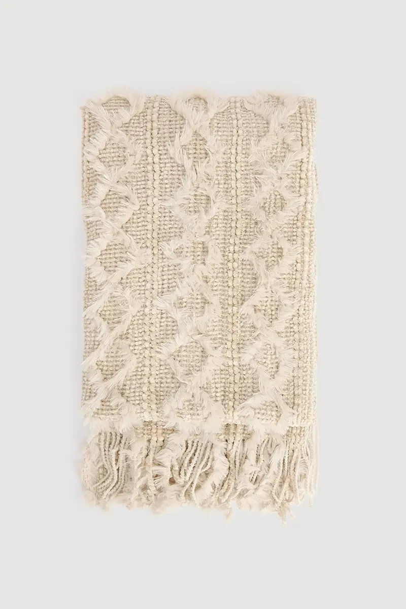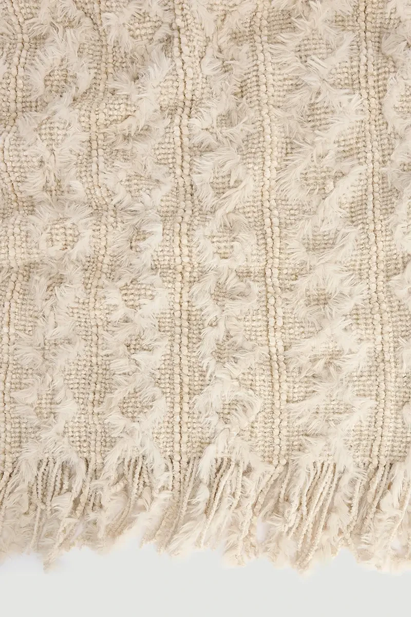 The ecru color adds a soft and elegant appearance. The tassel details offer a modern touch. The thick knit structure provides warmth and comfort. Its wide form allows versatile use. It is a refined accessory that completes winter outfits.