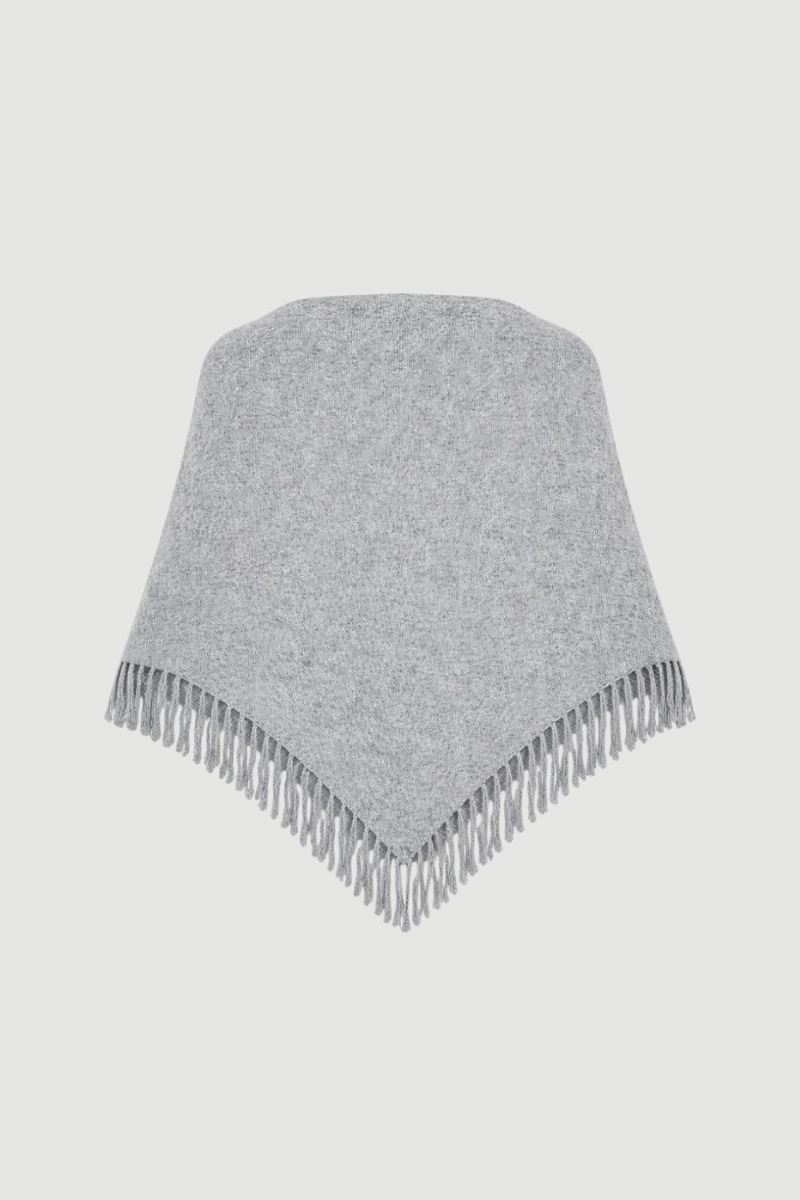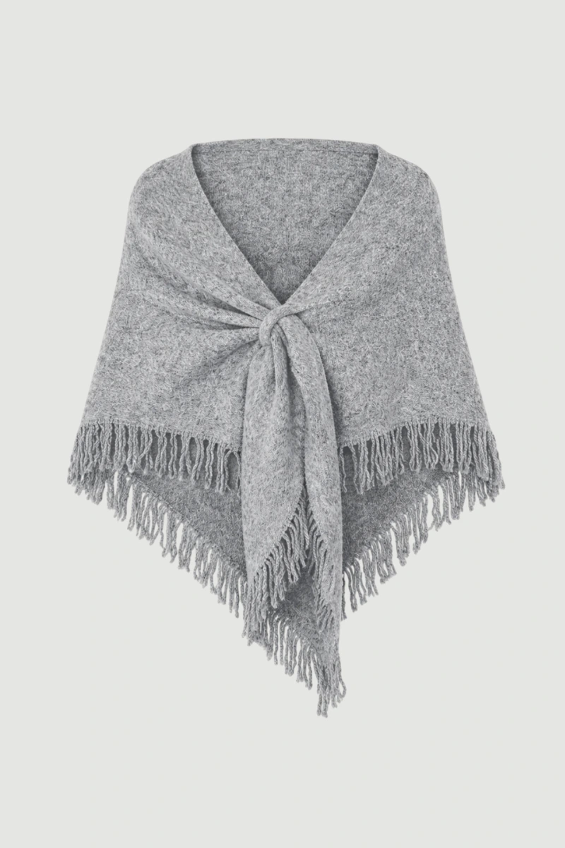 The grey color provides a modern and timeless style. The wool texture ensures warmth and comfort. Fringe design creates a dynamic look. The triangular cut allows for versatile tying styles.