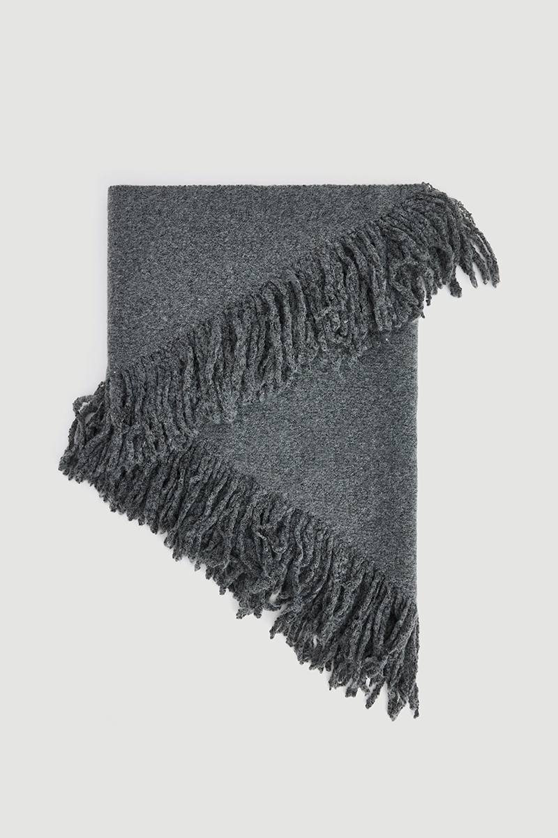 The wool fabric provides warmth and softness. Its grey tone harmonizes effortlessly with all colors thanks to its neutral character. The triangular form offers ease of styling in different ways. The tassel details add a bohemian touch. It is an elegant accessory that complements both daily and classic outfits.