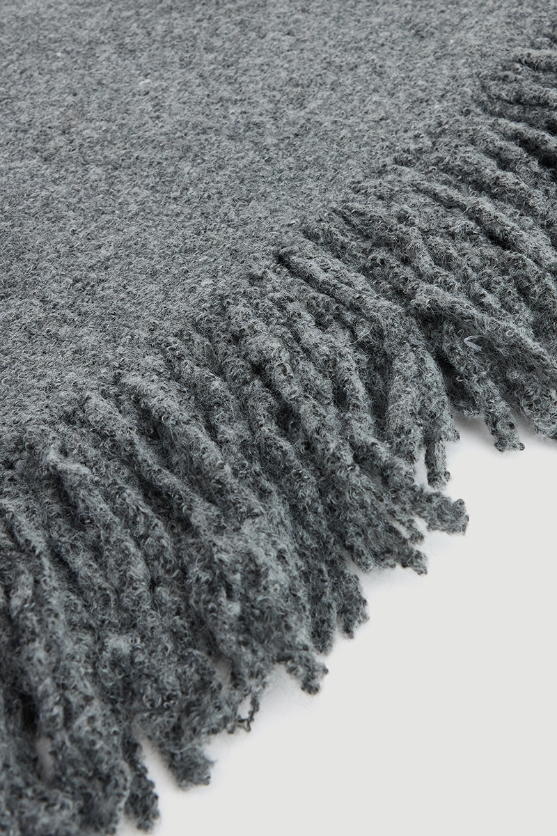 The wool fabric provides warmth and softness. Its grey tone harmonizes effortlessly with all colors thanks to its neutral character. The triangular form offers ease of styling in different ways. The tassel details add a bohemian touch. It is an elegant accessory that complements both daily and classic outfits.