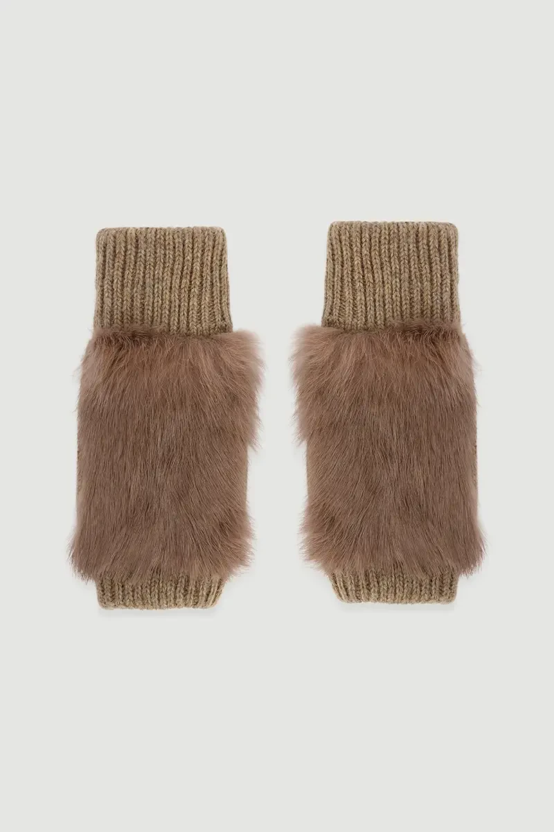 Its mink color offers a soft and elegant look. The ribbed detail adds a modern touch of style. The fur-lined interior provides warmth and comfort. The stitching details draw attention. It is both a practical and chic accessory in cold weather.