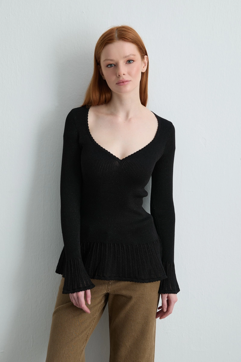 This heart-neck knit blouse, representing a romantic style, adds a feminine touch with elegant ruffle details. Its black color matches any outfit and offers versatile use from daily wear to special events.