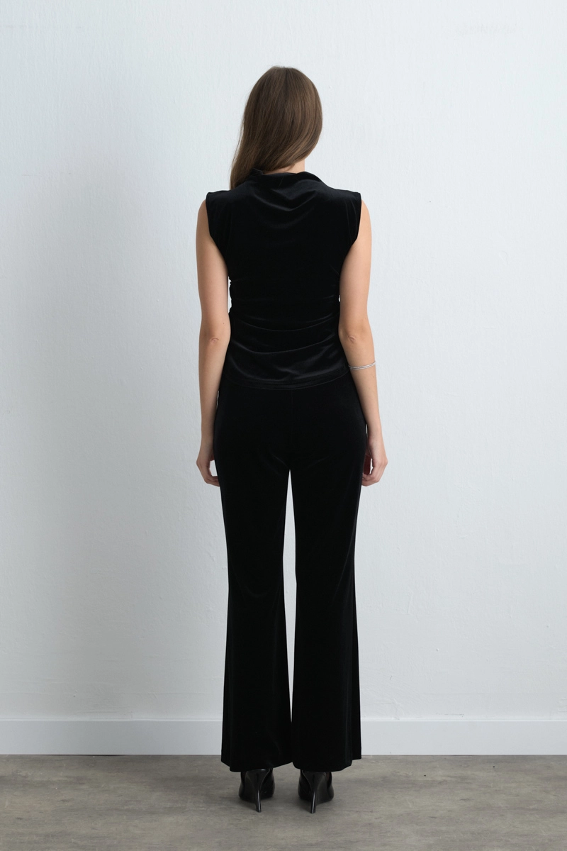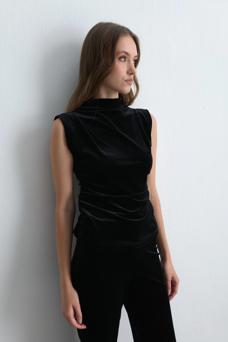 This blouse combines the luxurious texture of velvet with a modern design, reflecting elegance in black. The high collar and gathered details offer feminine sophistication, suitable for special occasions or evening dinners. Paired with sparkling accessories, it creates a bold style. The relaxed fit merges style with all-day comfort.