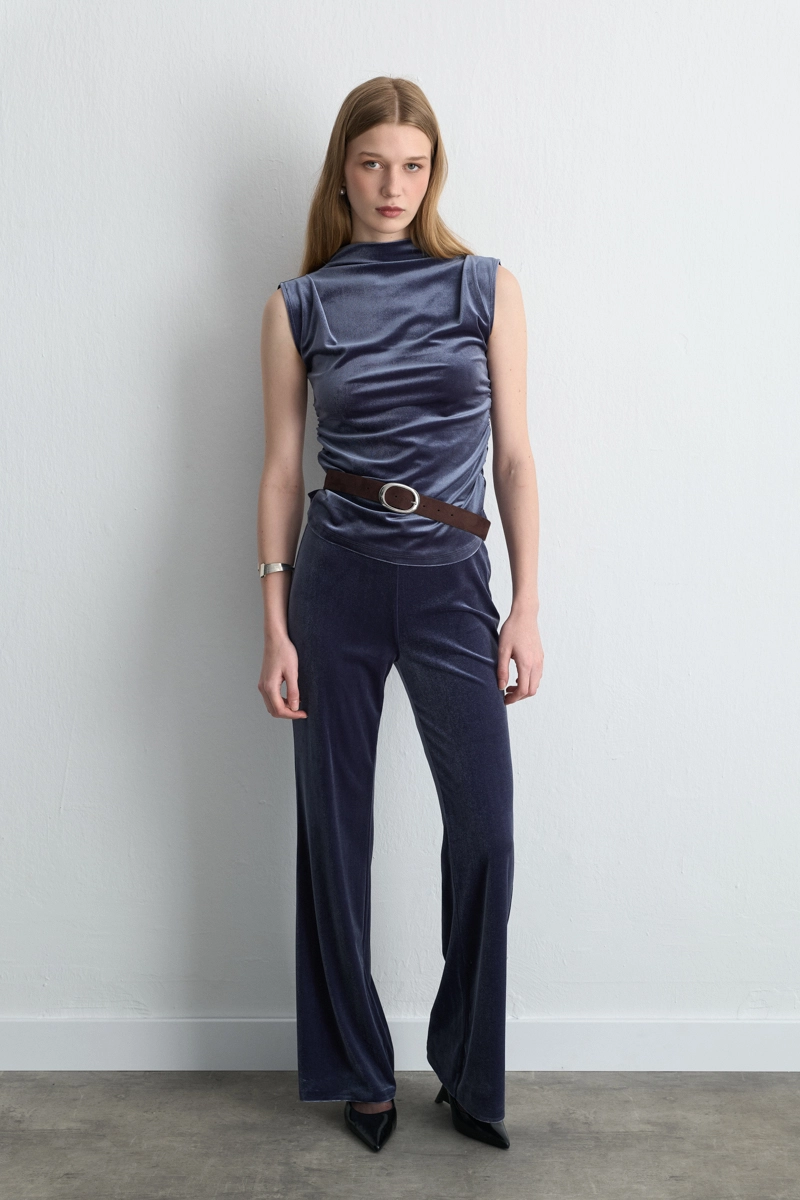 This blouse, with a modern grey tone and velvet texture, provides a sophisticated look and stands out with its elegance. The high collar and gathered details offer a feminine silhouette and timeless charm. Suitable for daily wear to evening outfits. Pair with shiny accessories and elegant trousers for a refined style.