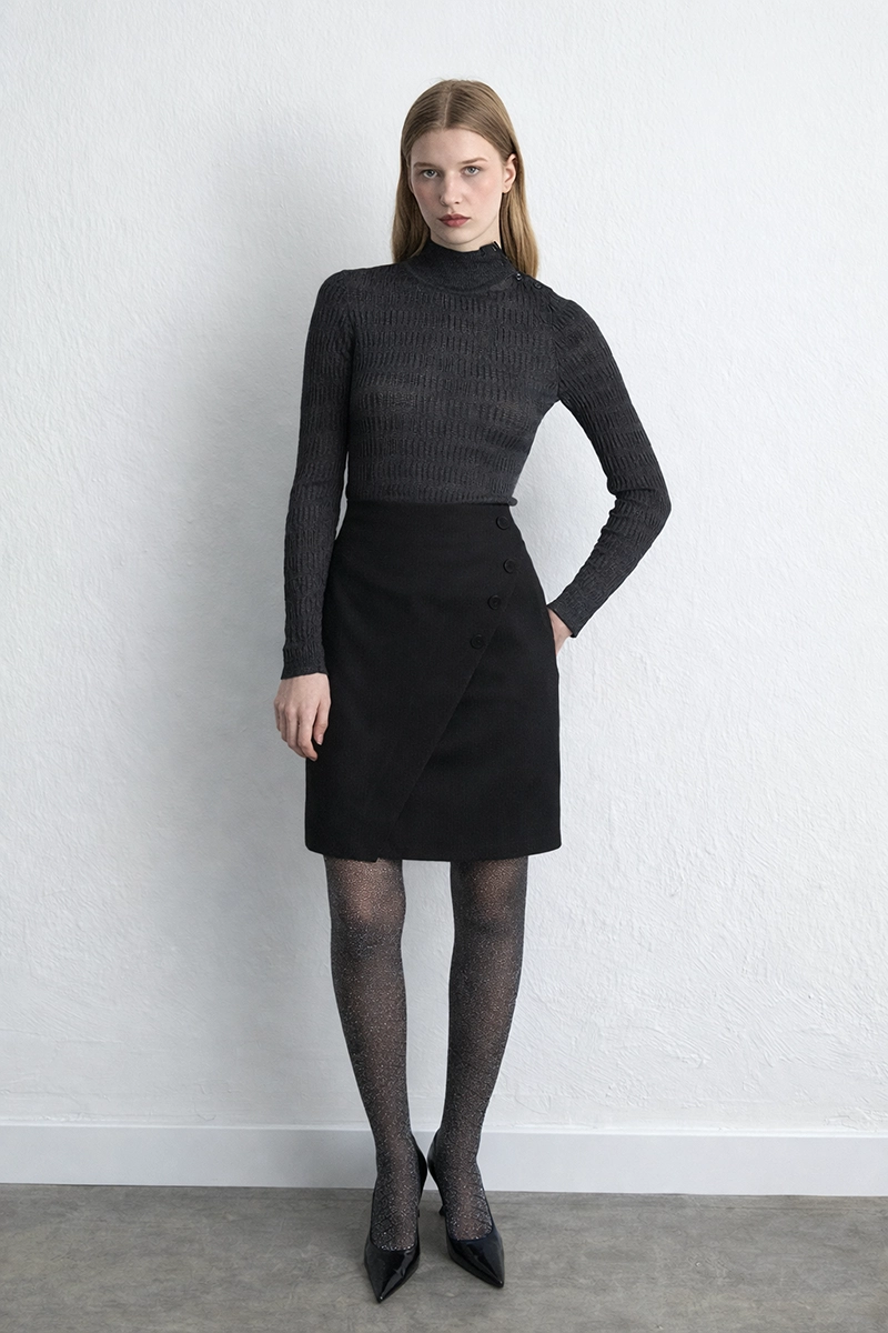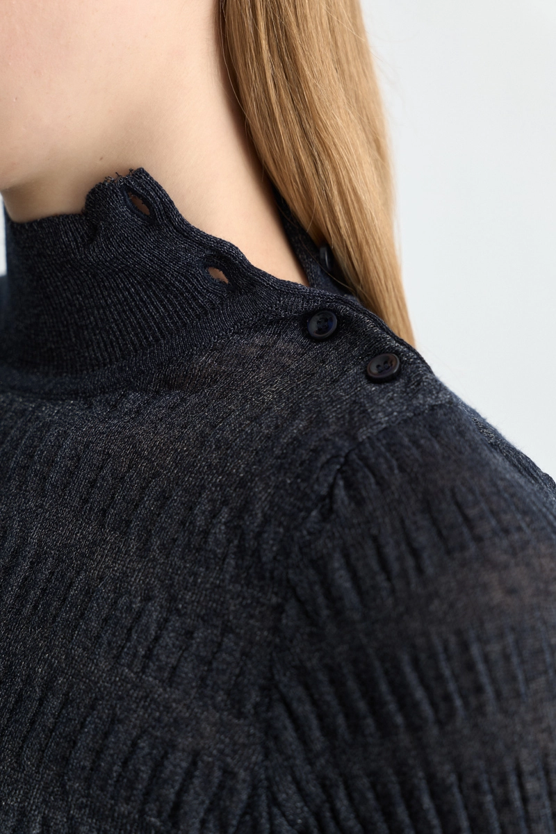 Its navy color offers a sophisticated look. The seersucker texture creates a modern depth of texture. The stand-up collar detail adds a noble appearance. Its flexible knit structure provides a comfortable fit. It completes daily elegance with simple lines.