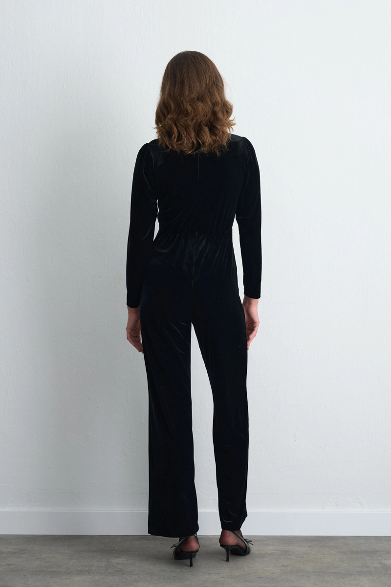 Velvet fabric provides an elegant and sophisticated look. The stand-up collar detail creates a modern line. The black tone reflects a noble and strong style. Its flowing form gives a graceful silhouette to the body. Offers bold elegance from special events to city evenings.