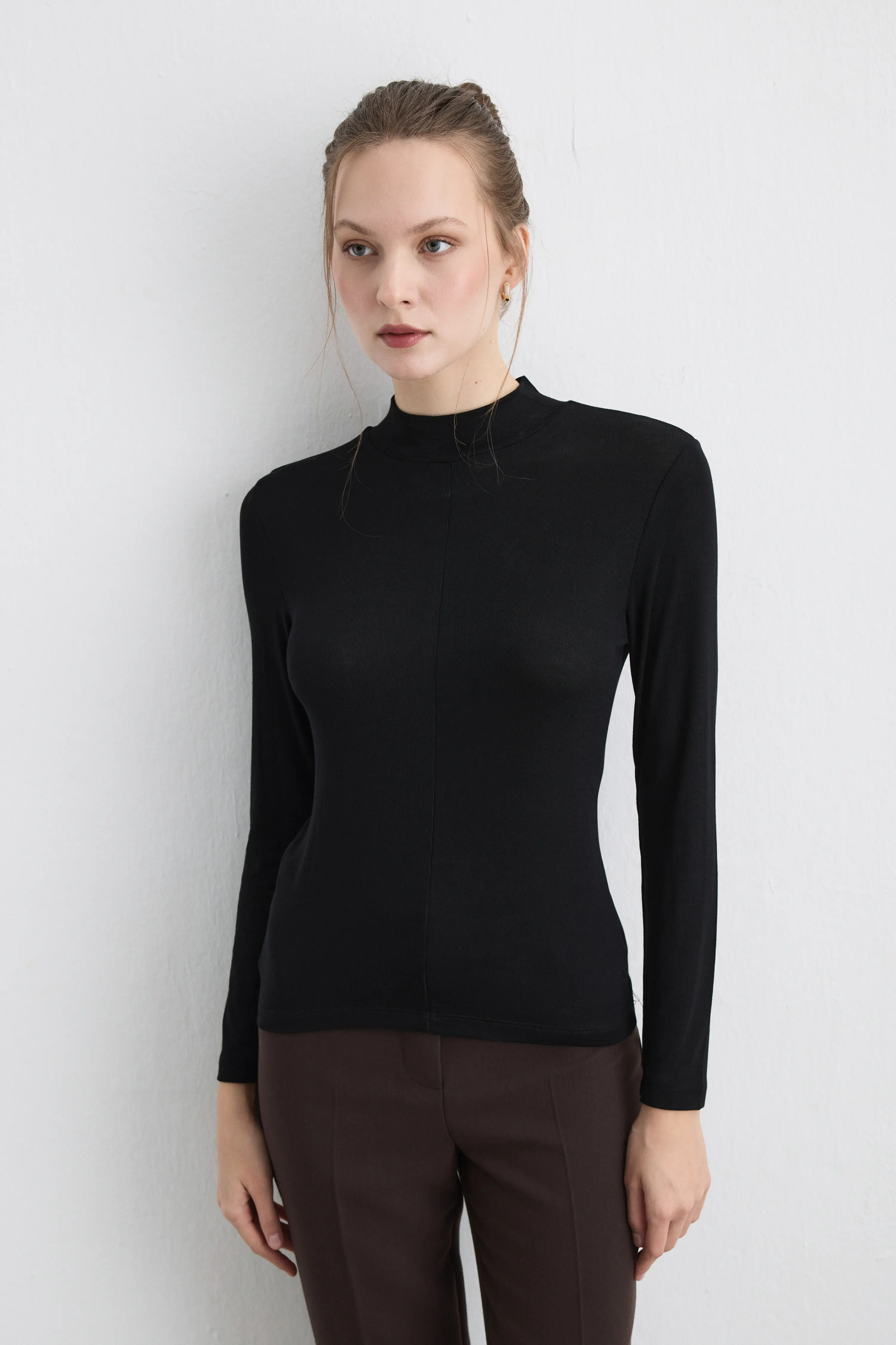 With modern and simple lines, this piece fits into any wardrobe. The stretchy fabric allows freedom of movement, while the stand collar creates a strong silhouette. A perfect complement for layered outfits.